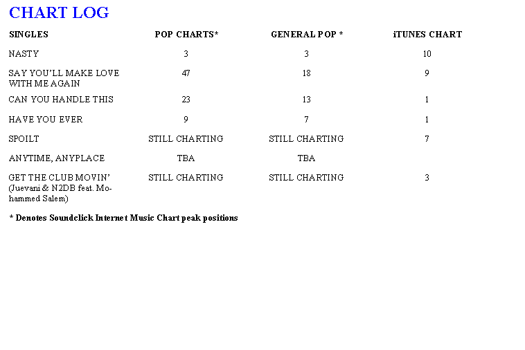Mojo--Copyright, 2004. All Rights Reserved. 1. prologue* 2. when doves cry 3. my theory* 4. mojo 5. the early night* 6. go deep 7. can you handle this 8. meant to be* 9. have you ever 10. wind* 11. say you'll make love with me again 12. inside of me 13. are you ready?* 14. spoilt 15. time* 16. all about me (feat. jive jones) 17. nasty 18. words of wisdom* 19. leap of faith 20. looking in 21. anytime, anyplace 22. epilogue* bonus tracks: 23. nasty (drums of love remix) 24. injustice (the punishment remix)